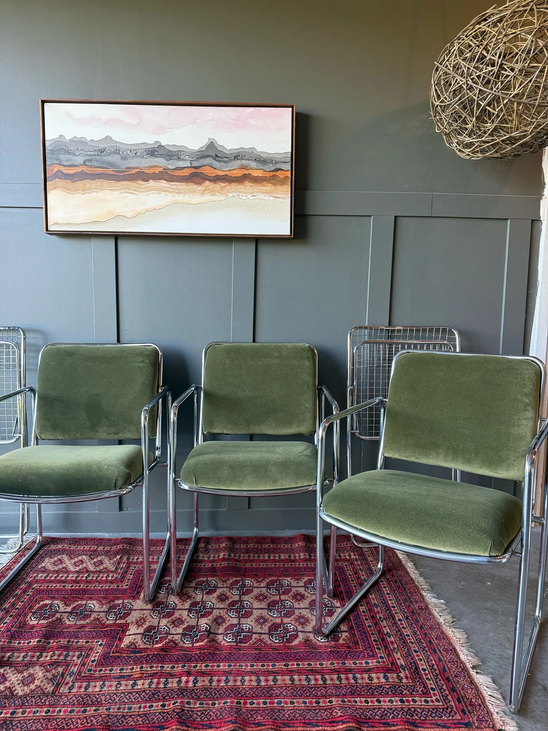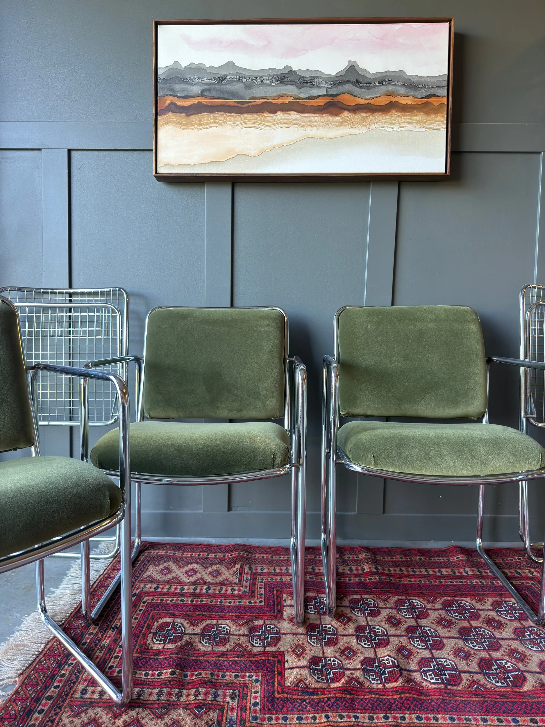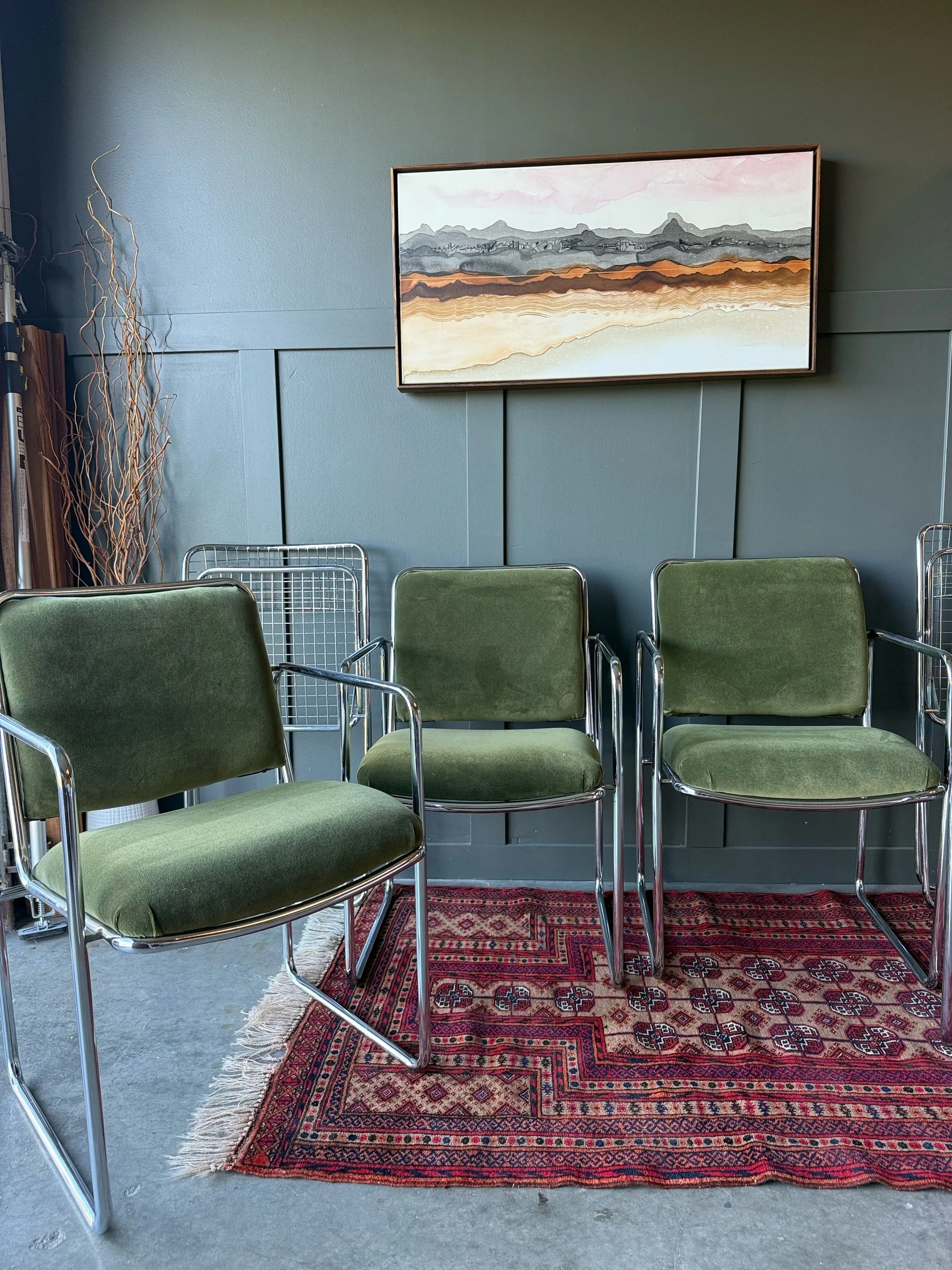 This set of 4 vintage tubular chrome chairs has been reupholstered in a rich, dark green velour — a durable fabric that adds both comfort and luxe texture. Upholstery expertly done in collaboration with @audley.interiors.