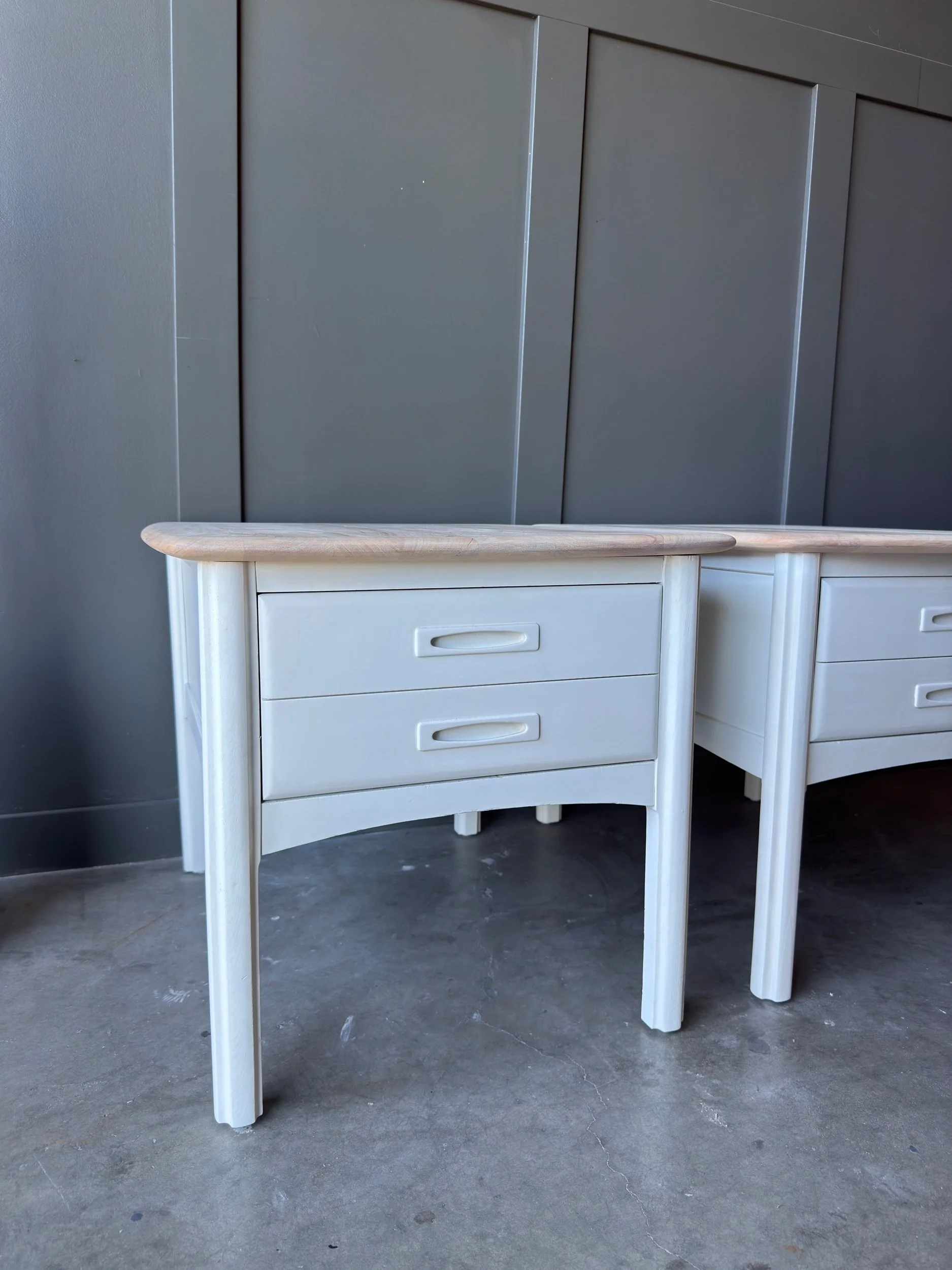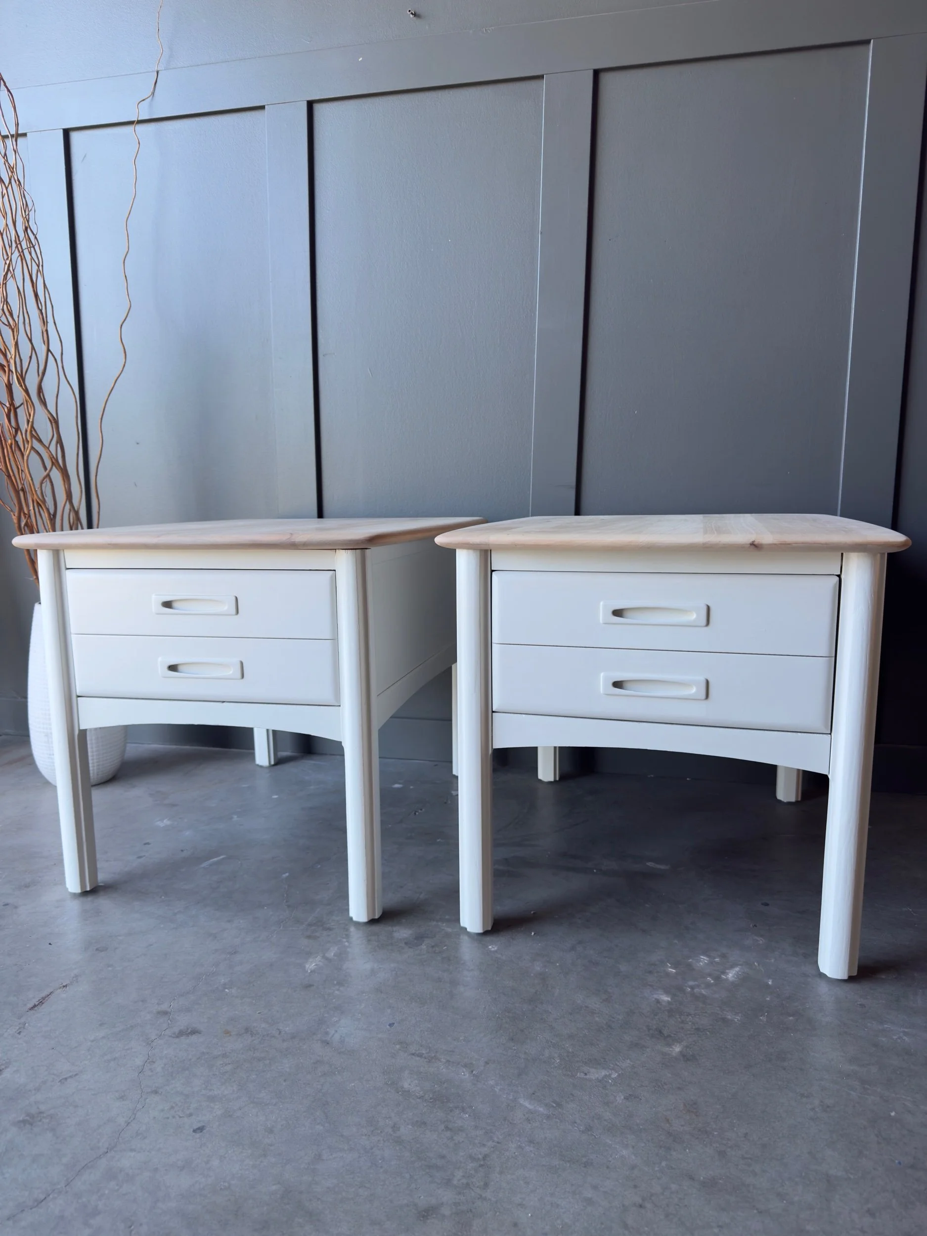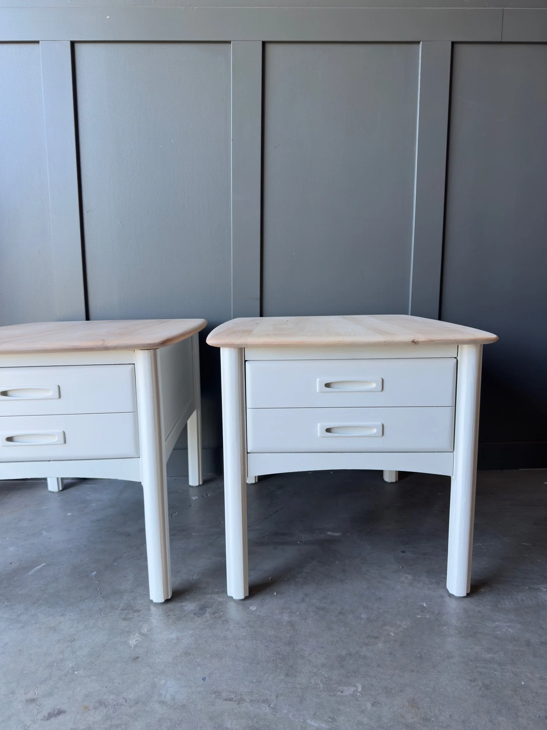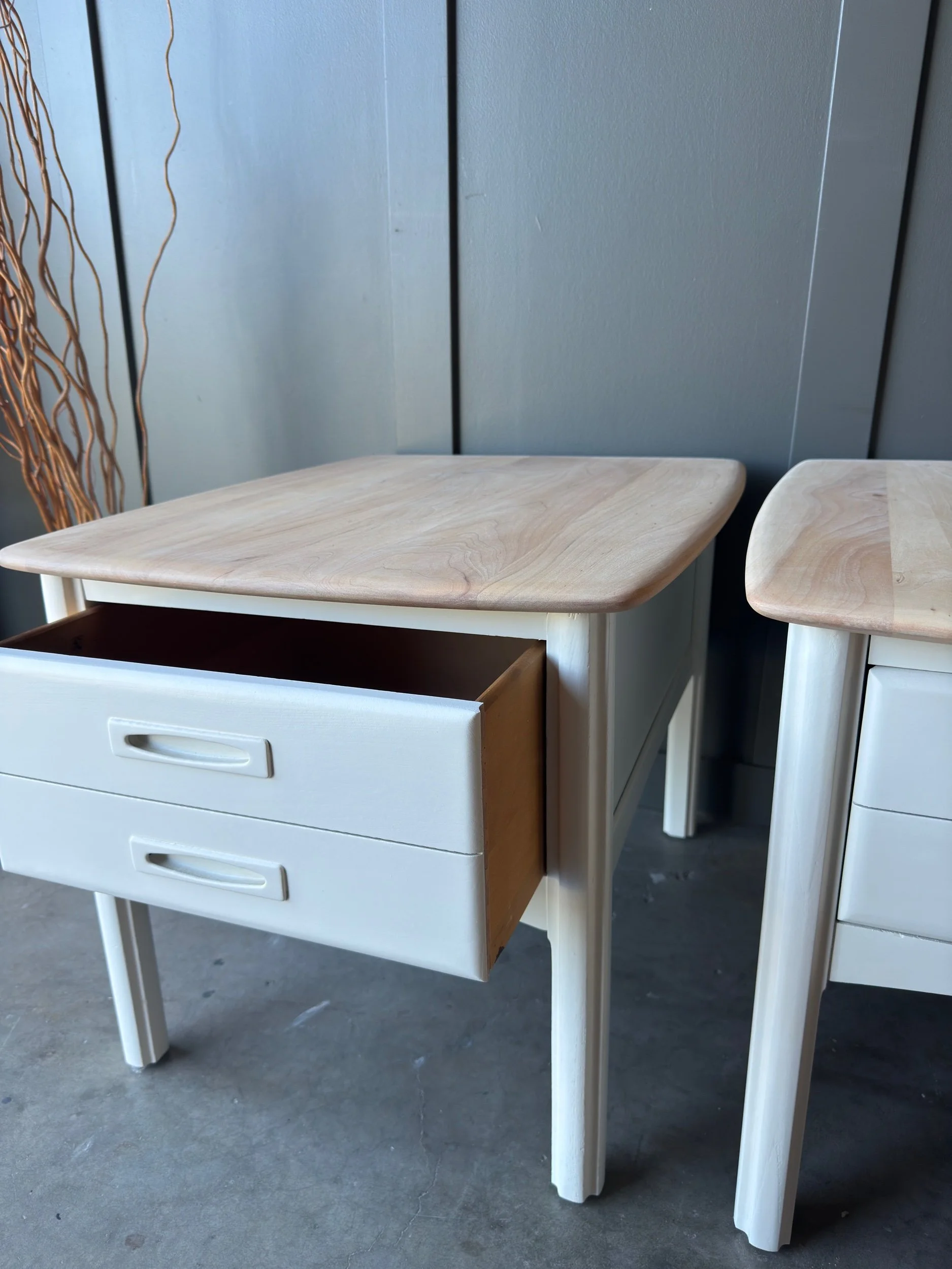 Refinished side tables. Painted in Swiss coffee, solid maple top refinished Rubio natural. Each drawer has one nice deep drawer.